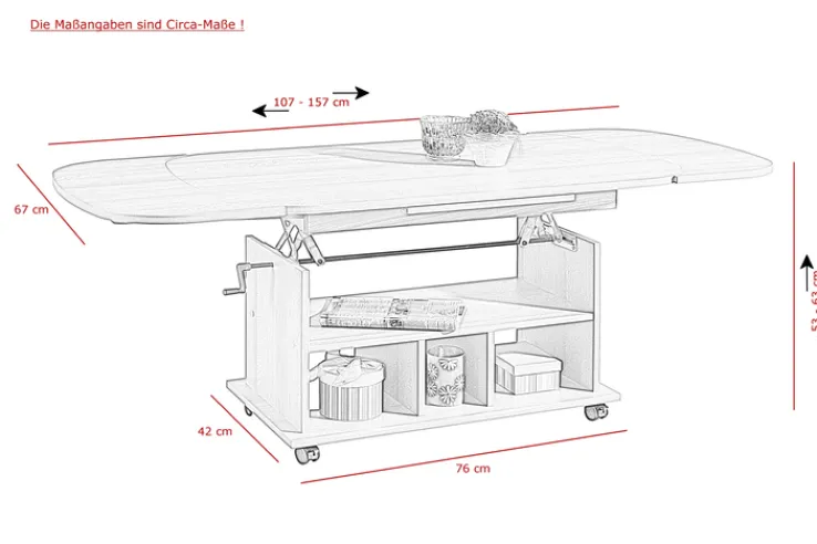 Breite: 107,00 cmHöhe: 53,00 cmLänge: 67,00 cmGewicht: 31,80 kgTischlänge max. bei Auszug/Erweiterung: 157,00 cmmaximale Höhe von/bis: 63,00 cm