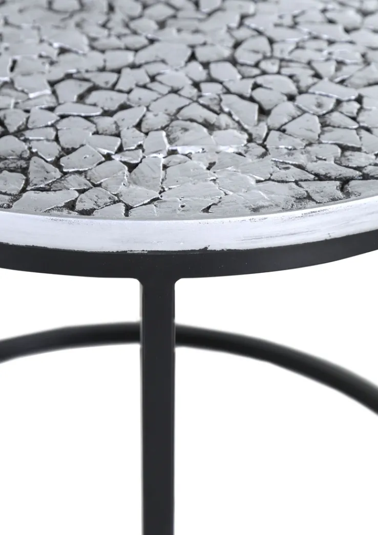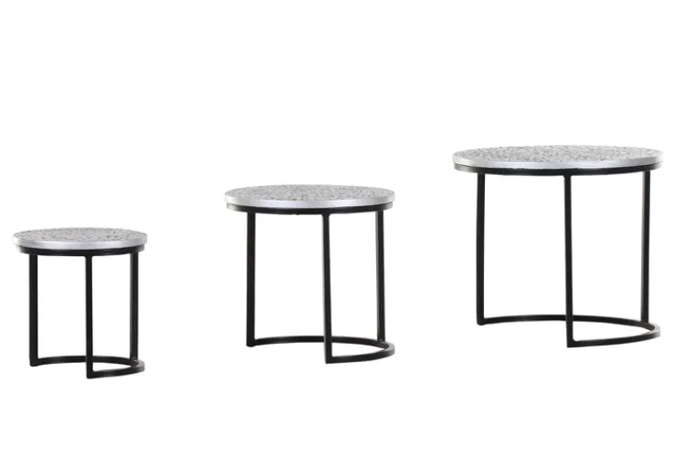 Das Beistelltisch-Set „TEATIME“ besteht aus drei runden Tischen in unterschiedlichen Größen, die sich ideal für vielseitige Einsatzmöglichkeiten eignen. Die Tische sind aus einer Kombination von Holznachbildung und Metall gefertigt, was ihnen eine robuste und zugleich elegante Ausstrahlung verleiht. Die Tischplatten sind in einem ansprechenden Silberfarbton gehalten, der durch die lackierte Oberfläche zusätzlich hervorgehoben wird. Die schwarzen Metallgestelle bieten einen stabilen Stand und ergänzen das moderne Design.