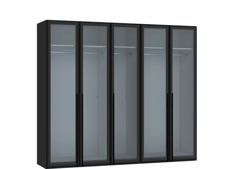 Der Drehtürenschrank aus der Serie Longline bietet eine moderne und elegante Lösung für Ihre Aufbewahrungsbedürfnisse. Mit einer Breite von 250 cm, einer Höhe von 220 cm und einer Tiefe von 58,5 cm bietet dieser Schrank großzügigen Stauraum. Die fünf Drehtüren sind mit Rauchglas versehen, das dem Schrank ein stilvolles und zeitgemäßes Aussehen verleiht. Die Hauptfarbe des Schranks ist ein edles Novaschwarz, das perfekt mit den grauen und schwarzen Akzenten harmoniert.