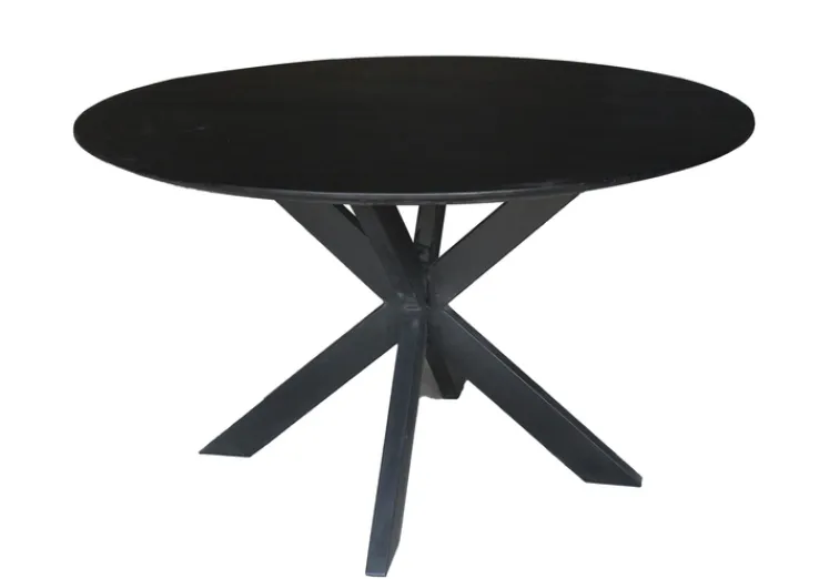 Der Esstisch ARAS kommt in schlichtem und funktionalem Design daher. Auf dem schwarzem Spinngestell aus Metall ruht eine runde Holztischplatte mit einem Durchmesser von 150 Zentimetern. Der Tisch ist 76 Zentimeter hoch und somit perfekt für alle handelsüblichen Stühle. Die schwarz lackierte Tischplatte ist aus massivem Holz gefertigt und dadurch sehr robust und belastbar.