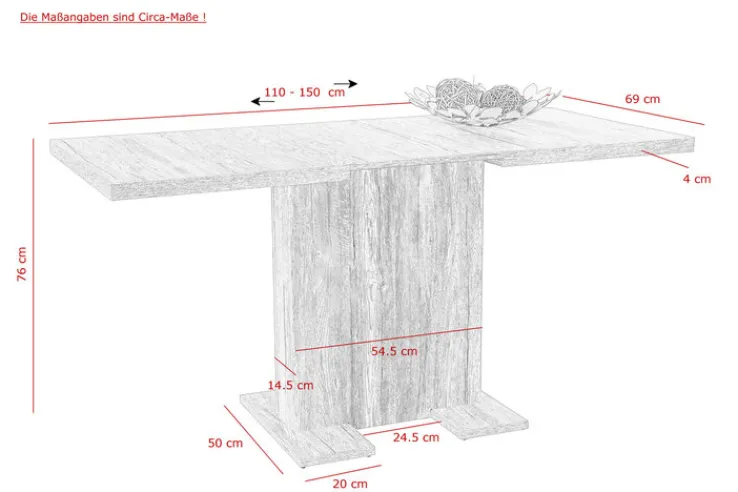 Breite: 70 cmHöhe: 76 cmLänge: 110 cmGewicht: 28,9 kgTischlänge max. bei Auszug/Erweiterung: 150 cm