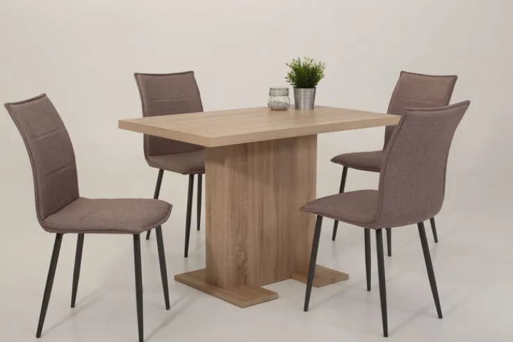 Der Esstisch BRITT misst in Länge und Breite 110-150 x 70 cm. Es handelt sich um eine Nachbildung von Sonoma Eiche. Der Säulentisch ist mit einem Synchronauszug versehen.