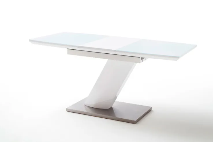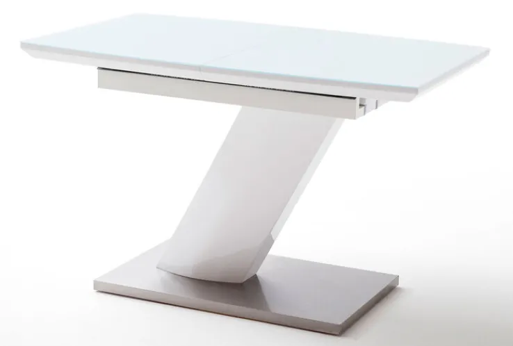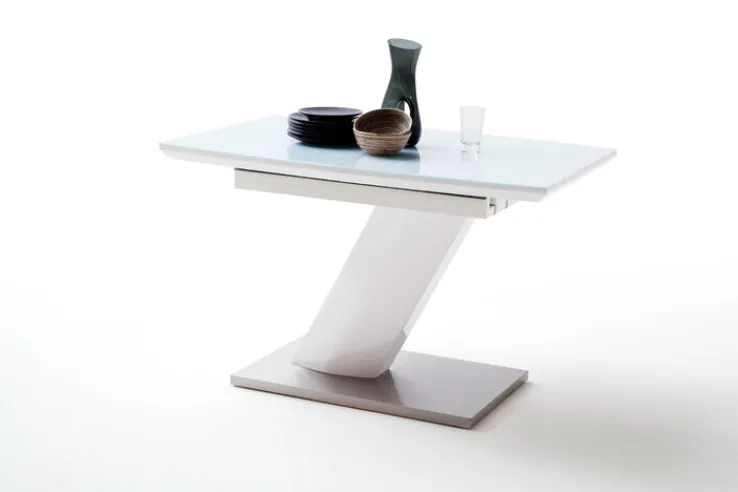 Der moderne Esstisch HOLLY mit Einlegeplatte sollte in den Innenbereichen des Hauses platziert werden und besteht aus einem Materialienverbund aus Glas, Holznachbildung und Metall. Da die MDF-Platte mit Sicherheitsglas verstärkt ist und die Bodenplatte mit den Maßen 91 x 50 x 5 cm aus hochwertigem Edelstahl gefertigt ist, ist der Tisch mit der in Hochglanz Weiß lackierten Säule besonders stabil und widerstandsfähig.