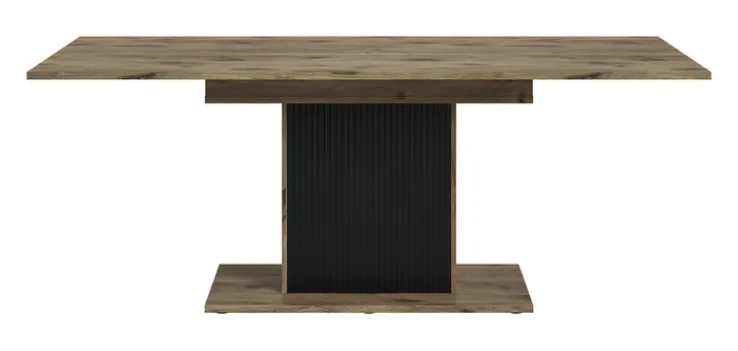 Der Esstisch aus der Serie LOU überzeugt durch seine moderne Gestaltung und eine klare Linienführung. Die Tischplatte und das Säulengestell zeigen eine markante Nox Oak Nachbildung mit natürlicher Maserung in einem warmen Braunton. Das mittig platzierte Säulengestell ist an der Front mit einer vertikal gerillten, dunklen Applikation versehen, die einen stilvollen Kontrast zur Eichenoptik bildet. Die Oberfläche wirkt gleichmäßig matt und unterstreicht das zeitgemäße Design des Tisches.