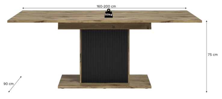 Mit einer Länge von 160 cm, erweiterbar auf bis zu 200 cm, bietet der Tisch flexible Nutzungsmöglichkeiten im Esszimmer. Die Breite beträgt 90 cm, die Höhe liegt bei 76 cm, das Gewicht bei 53 kg. Der Tisch besteht aus einer Holznachbildung und ist ausziehbar konzipiert. Die Kombination aus Dekorfarbe Eiche und der modernen Gestellform macht dieses Modell zu einer praktischen Lösung für den Wohnbereich.