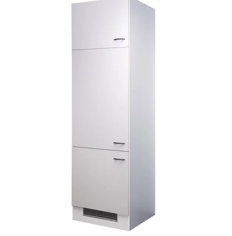 Mit einer Breite von 60 cm, einer Tiefe von 57 cm und einer Höhe von 200 cm bietet der Schrank großzügigen Stauraum und eignet sich optimal zur Integration von Geräten. Im Inneren befinden sich drei Einlegeböden, die eine flexible Nutzung des Stauraums ermöglichen. Das Gesamtgewicht beträgt 54,1 kg. Die Konstruktion basiert auf Spanplatten, was für eine solide und stabile Ausführung sorgt. Das klare, moderne Design integriert sich nahtlos in verschiedene Küchenstile und unterstützt eine funktionale Raumnutzung.