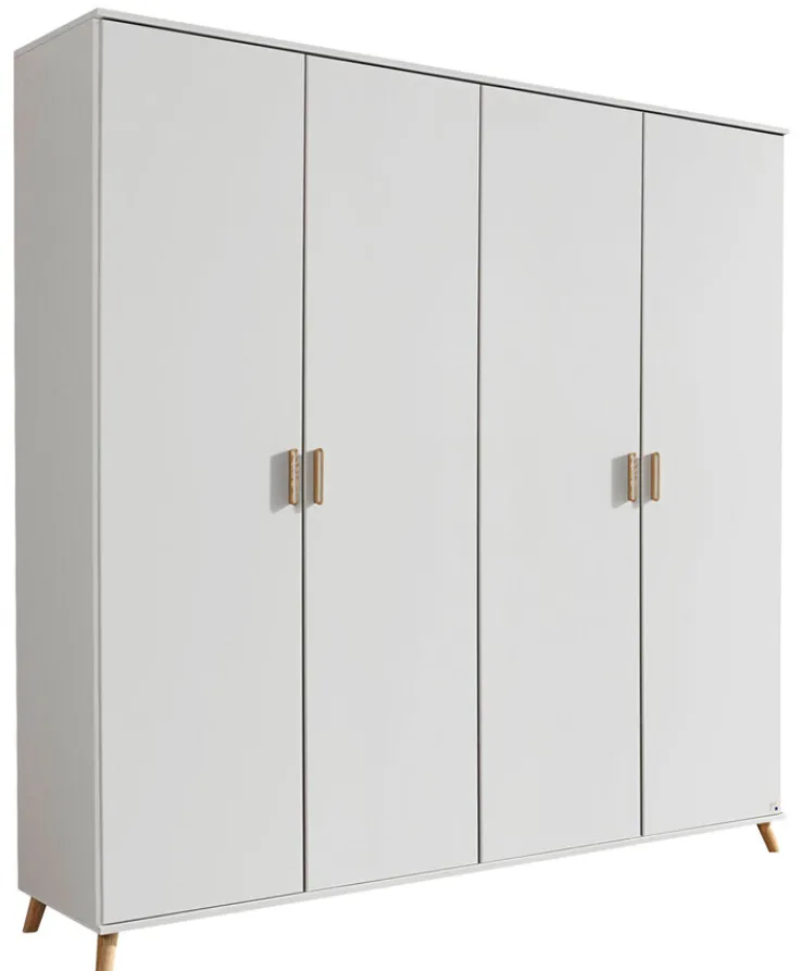 Der Kleiderschrank bietet vier Drehtüren, hinter denen vier Fachböden und eine Kleiderstange zu finden ist. Somit eignet er sich nicht nur für die Unterbringung der Garderobe, sondern kann auch Bettwäsche und Handtücher beherbergen. Außerdem ist er sehr hochwertig verarbeitet und somit sehr robust. Er besteht aus einer Kombination aus einer Holznachbildung und Metall. Die Griffe und die Füße sind aus Holz gemacht. Letztere geben dem Schrank trotz seiner Größe eine herrlich luftige Ausstrahlung. Der Schrank wurde in Deutschland gefertigt und mit dem Blauen Engel ausgezeichnet.