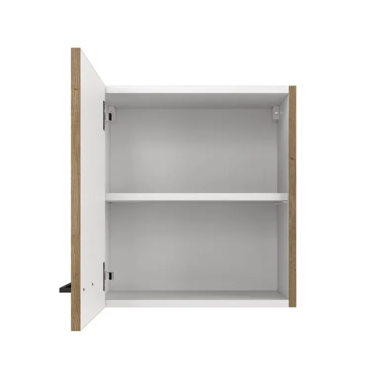 Der Hängeschrank für die Küche präsentiert sich in einem ansprechenden Design aus Artisan Eiche Nachbildung. Mit einer Breite von 50 cm, einer Höhe von 54,8 cm und einer Tiefe von 32 cm bietet er ausreichend Stauraum für Ihre Küchenutensilien. Die warme braune Farbe und die natürliche Holzmaserung verleihen dem Schrank eine zeitlose Eleganz, die sich harmonisch in verschiedene Kücheneinrichtungen einfügt. Ausgestattet mit einer Drehtür und einem Einlegeboden, ermöglicht der Schrank eine flexible Nutzung des Innenraums. Das Material besteht aus einer robusten Holznachbildung, genauer gesagt Spanplatte, die Langlebigkeit und Stabilität gewährleistet. Der schwarze Griff an der Tür setzt einen modernen Akzent und rundet das Gesamtbild stilvoll ab. Dieser Hängeschrank ist eine praktische und ästhetische Ergänzung für jede Küche.