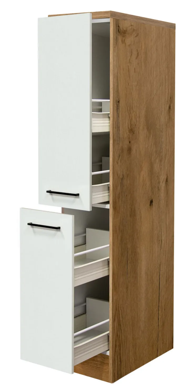 Der Vorteil von Apothekerschrank AVILA: Beim Ausziehen hat man den gesamten Inhalt vor Augen und kann kinderleicht das Benötigte entnehmen. Danach verschwinden Boxen und Packungen wieder in den Tiefen der Küche. Dabei punktet der in Weiß und Braun gehaltene Korpus mit einer pflegeleichten, abwaschbaren Oberfläche. Der Schrank ist mit einer Sockelblende ausgestattet und kann sich in jeder Küche sehen lassen.