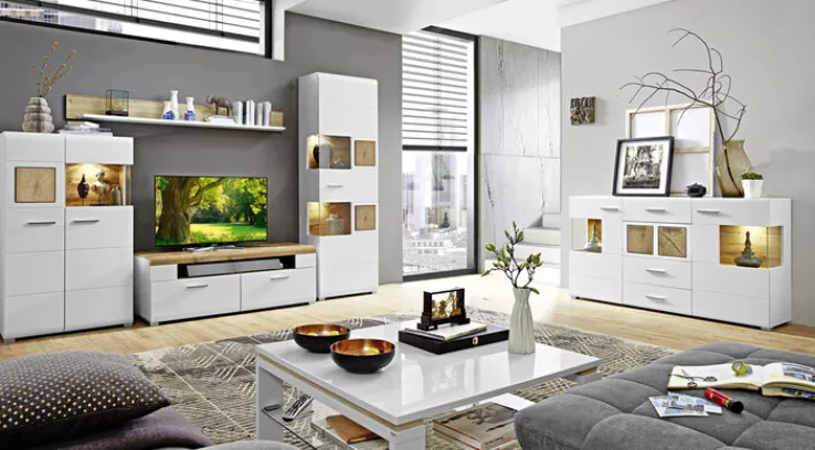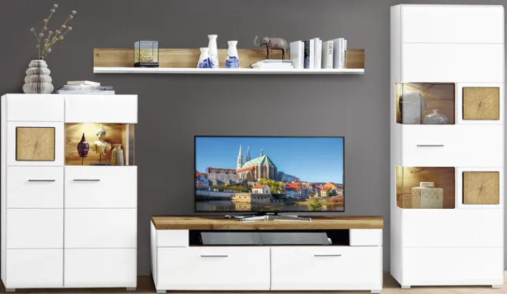Die 4-teilige Wohnwand FUN PLUS in Eiche/ Weiß verleiht dem Wohnzimmer mit ihrem modernen Look ein gemütliches Ambiente zum Wohlfühlen und bietet zudem jede Menge Stauraum.