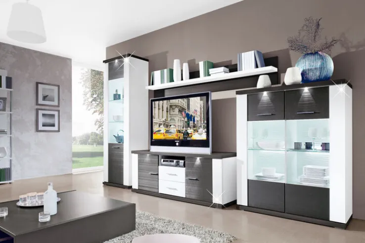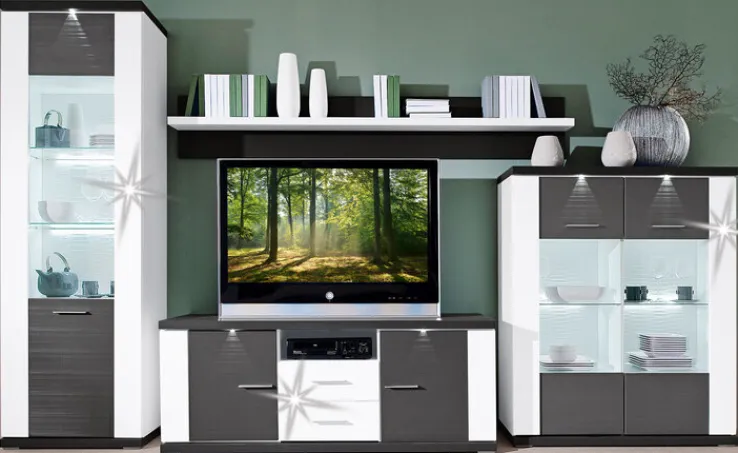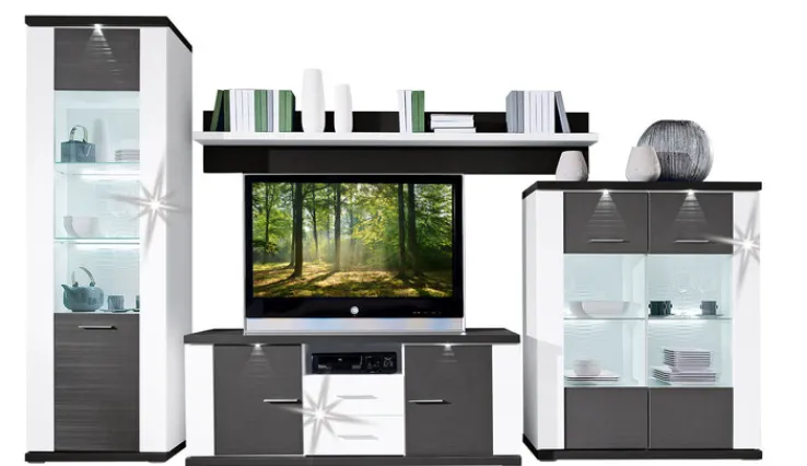 Diese Wohnwand mit einer Breite von 358 cm, einer Höhe 207 cm sowie einer Tiefe von 52 cm in Hochglanz-Optik ist das visuelle Highlight in jedem Wohnzimmer. Sie besteht aus insgesamt 4 Teilen, nämlich zwei Vitrinen, einem Lowboard sowie einem Wandboard. Um sie besser in Szene zu setzen, wurde die Wohnwand mit einer LED-Beleuchtung ausgestattet. Sie verfügt des Weiteren über eine Glastür, Glaseinlegeböden und ein Paneel mit Boden.