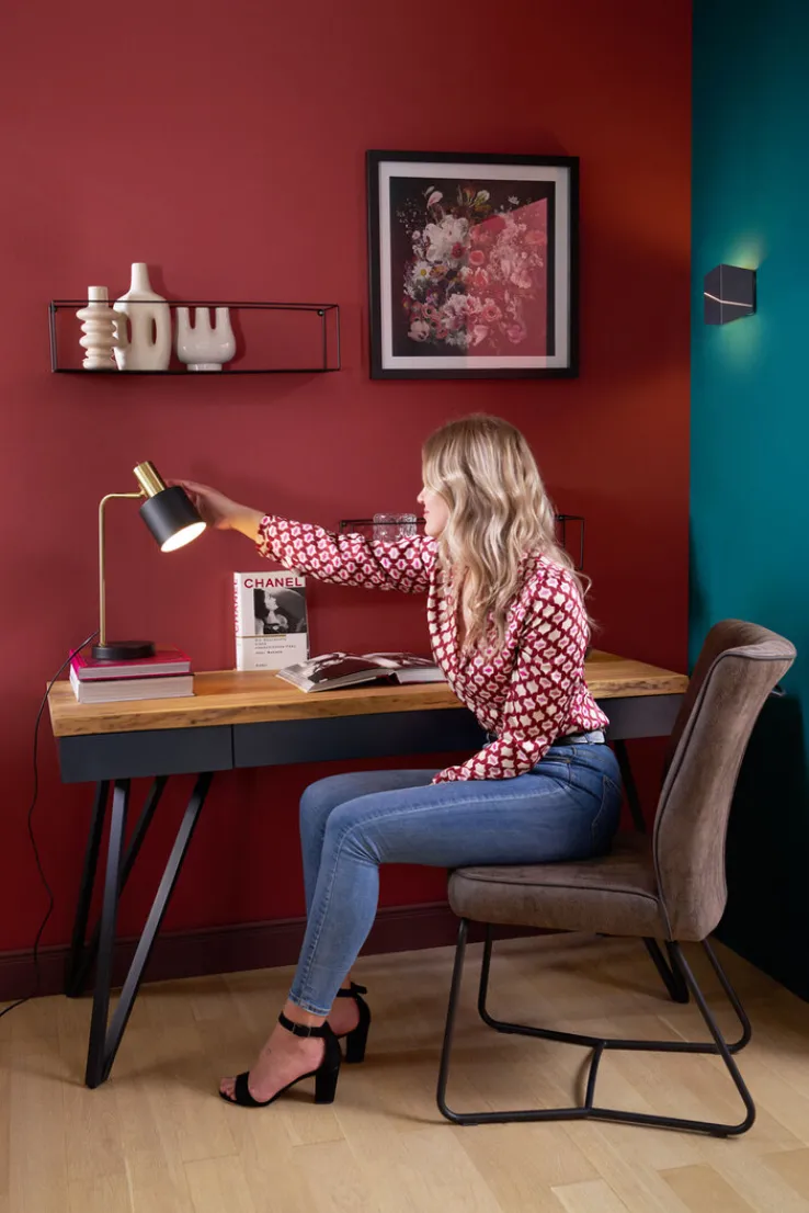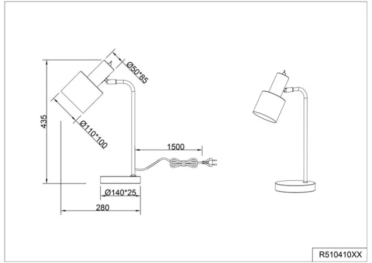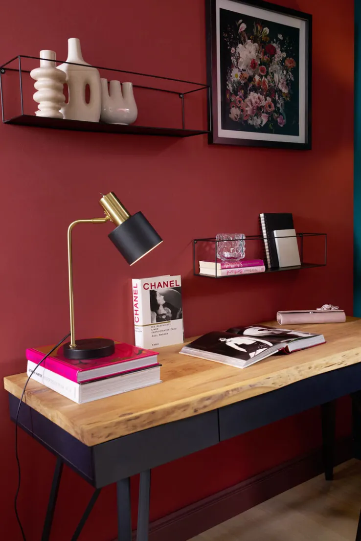 Die Tischlampe ist aus hochwertig verarbeitetem Metall hergestellt. Der runde Fuß und der Schirm sind lackiert. In den Schirm ist eine E14-Fassung für Leuchtmittel bis 40 Watt eingebaut. Auf der Rückseite des Lampenschirms ist ein Ein- und Ausschalter eingebaut. Die Tischlampe ist CE-geprüft.