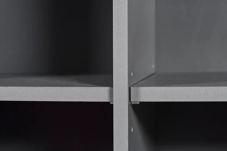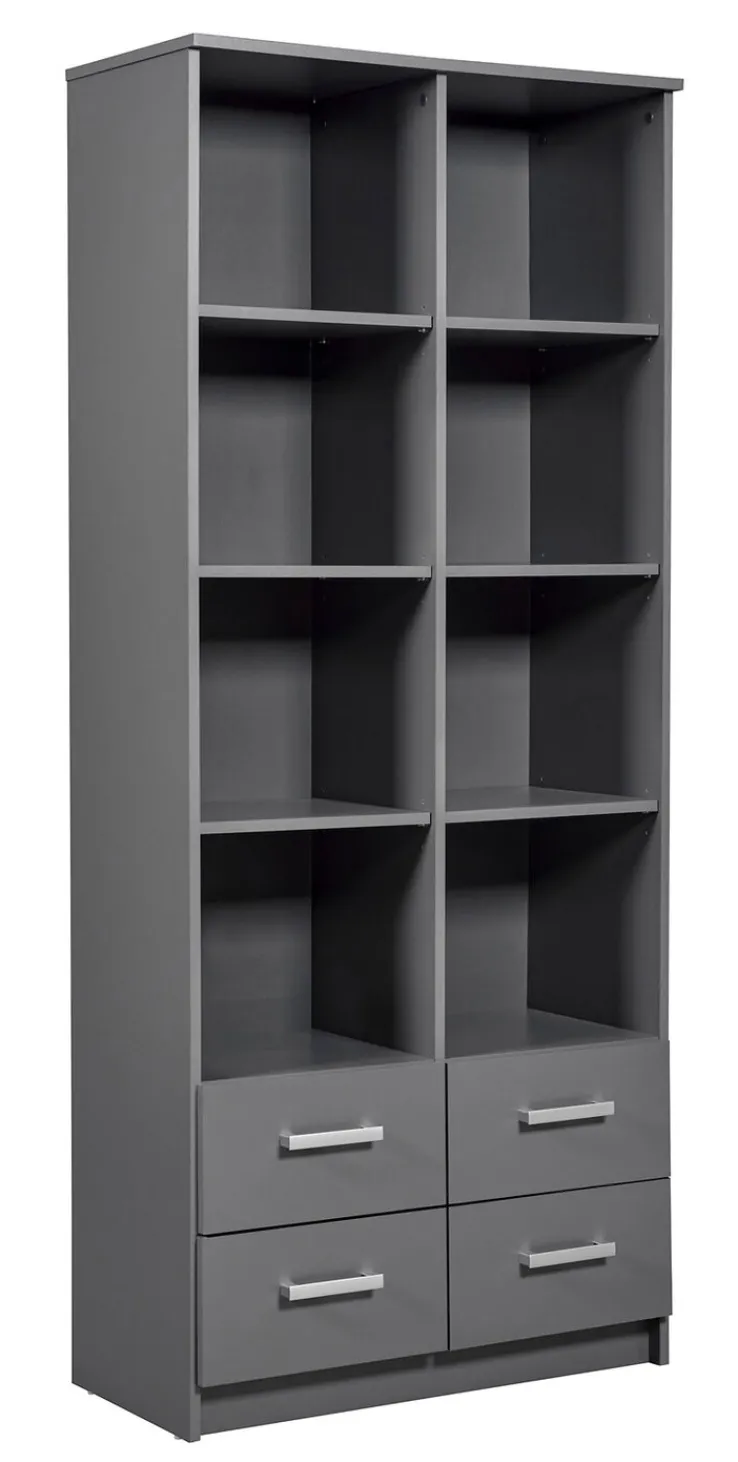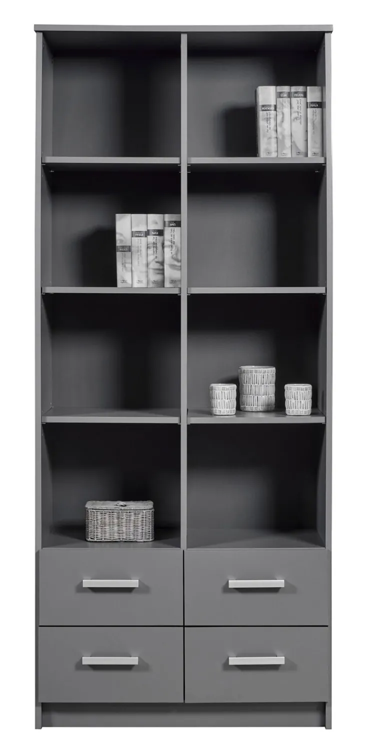 Das Regal ROBERT besteht aus einer grauen Holznachbildung. Es verfügt über 4 Schubkästen und 6 Einlegeböden. Seine Breite beträgt 81,5 cm, die Höhe liegt bei 191,2 cm und die Tiefe bei 40 cm.