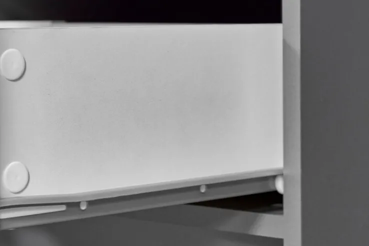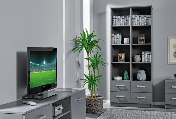 Das schicke Regal bietet eine ebenso dezente wie elegante Optik. Zudem ist reichlich Stauraum vorhanden. Die unten angebrachten Schubladen besitzen silberfarbige Griffe und können mit Elektronik oder Dingen, die nicht offen herumliegen sollen, bestückt werden. In den acht offenen Regalfächern haben Bücher, DVDs, Schmuckvasen, bei ausreichendem Licht kleine Topfpflanzen sowie attraktive Figuren Platz. So kann ein harmonisches Bild in Form zahlreicher Einzelteile entstehen.