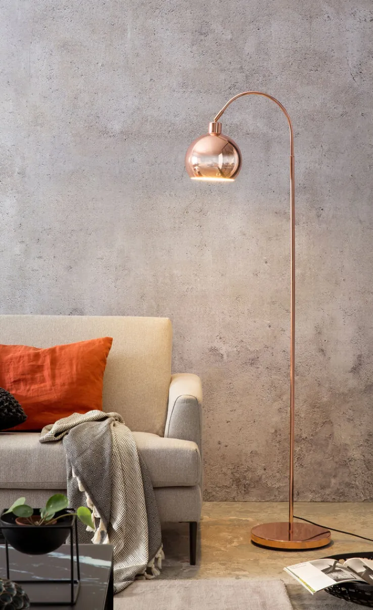 Die kupferfarbige Retrofit Stehlampe mit einer Höhe von 153 cm besticht auf den ersten Blick mit ihrem außergewöhnlichen Look. Zudem verleiht sie dem Wohnzimmer ein angenehm helles Licht, das auch zum Lesen die perfekte Helligkeit bietet.