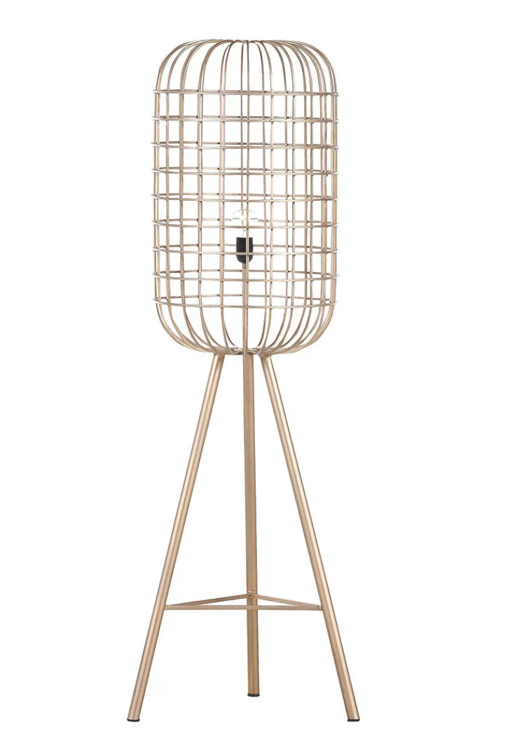 Besonders gut passt die aus Metall gefertigte Stehlampe zu Einrichtungen im Industrial-Style oder im Retro-Style. Sie eignet sich für viele Räume wie beispielsweise Wohnzimmer, Schlafzimmer, Dielen, Jugendzimmer, Lofts und Studios. Mit ihren goldfarben lackierten Metallteilen wirkt die Lampe sehr hochwertig. Ihr kolbenförmiger, vertikal ausgerichteter Korpus besteht aus feinen gebogenen Metallstreben, die gitterförmig miteinander verbunden sind. Sie lassen ein käfigähnliches Design entstehen, das zu fantasievollen und nicht alltäglichen Einrichtungsideen inspiriert. Ein 3-Bein-Gestell, das an ein Stativ oder eine Staffelei erinnert, verleiht der goldfarbenen Leuchte einen sicheren Stand.