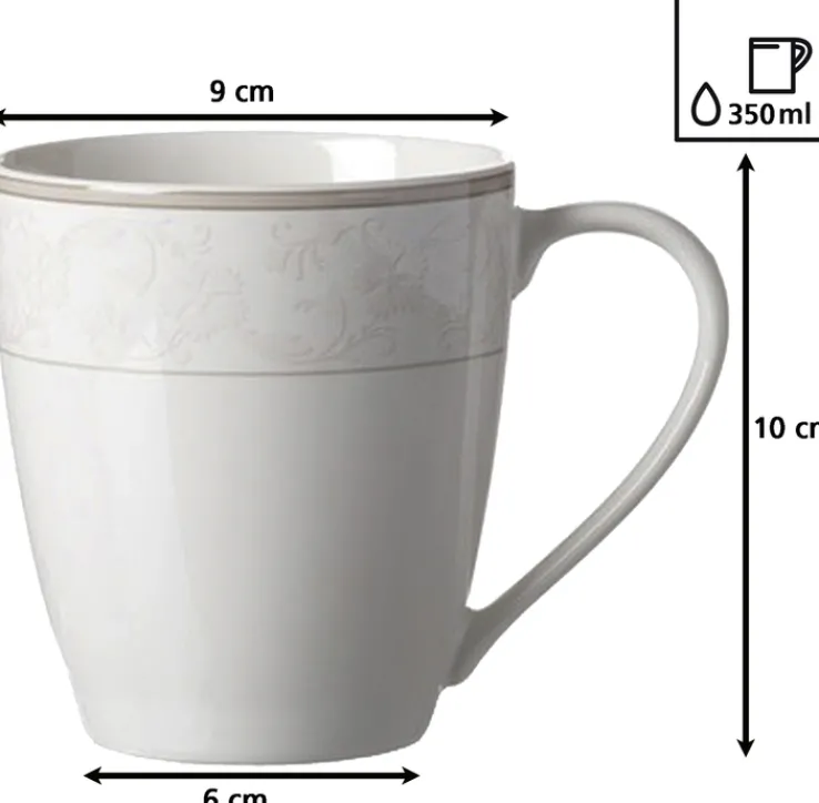 Dieser schöne Kaffeebecher aus der ISABELLA Serie besticht durch zarte, elfenbeinfarbene Ornamente, die als leichter 3D-Effekt. Der cremeweiße Becher bietet mit einem Fassungsvermögen von dreihundertfünfzig Millilitern Platz für Kaffee oder andere Heißgetränke. ISABELLA ist das perfekte Geschirr für besonders festliche Gelegenheiten wie Konfirmation, Kommunion, Hochzeit oder Weihnachten. Die komplette Kollektion ist aus hochwertigem Fine-China-Porzellan gefertigt und natürlich auch spülmaschinengeeignet.