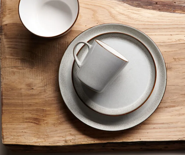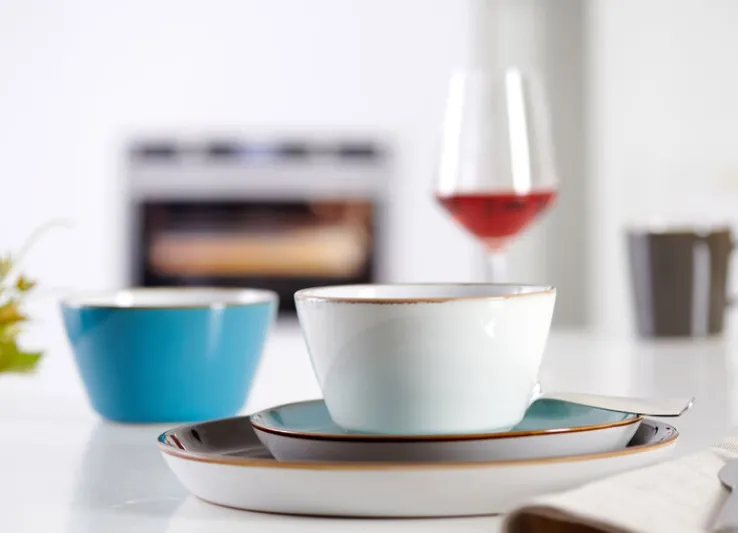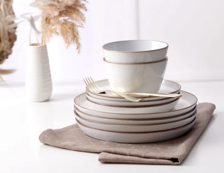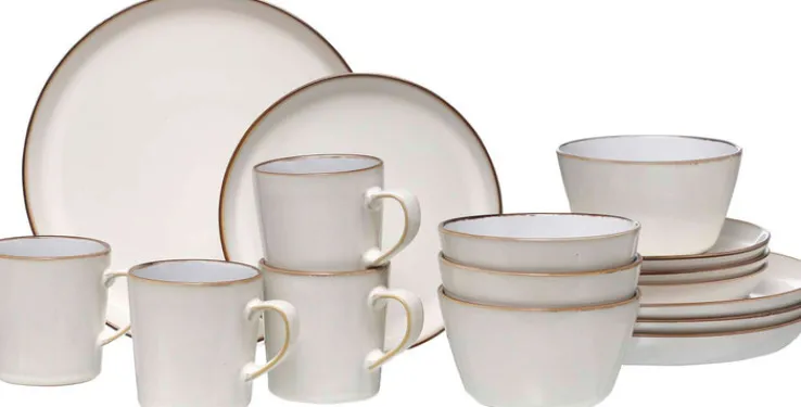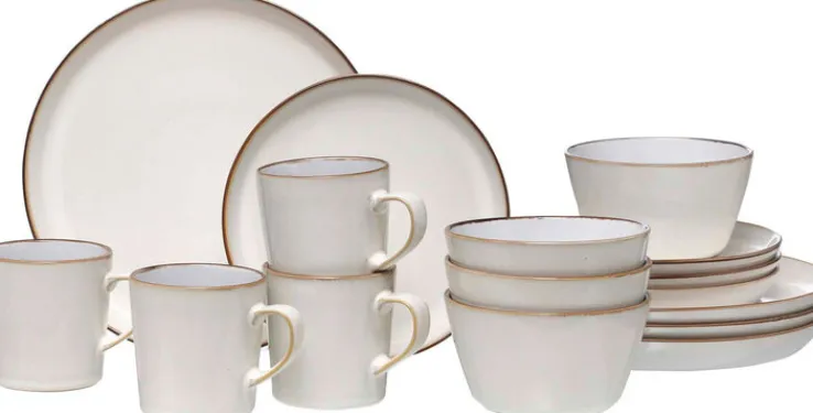 Mit dem weißen Kombiservice VISBY hat Ritzenhoff & Breker ein Geschirr im Sortiment, das sich für den täglichen Gebrauch eignet. Es zeigt sich schlicht im Design und wird durch eine braun gestaltete Oberkante verziert. Auch an den Henkeln der Tassen findet sich der braune Farbton wieder.