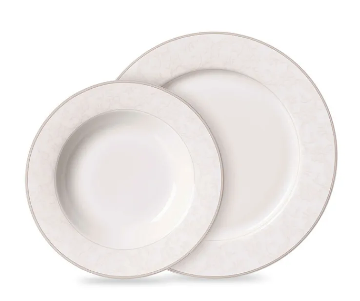 Zarte, elfenbeinfarbene Ornamente verschönern diese festliche, cremeweiße Tafelservice ISABELLA und erscheinen als leichter 3D-Effekt. ISABELLA ist das perfekte Geschirr für besonders festliche Gelegenheiten wie Konfirmation, Kommunion, Hochzeit oder Weihnachten. Das komplette Tafelset ist aus hochwertigem Fine-China-Porzellan gefertigt und besteht aus jeweils sechs tiefen und sechs flachen Teller. Natürlich ist das Tafelservice ISABELLA auch spülmaschinengeeignet