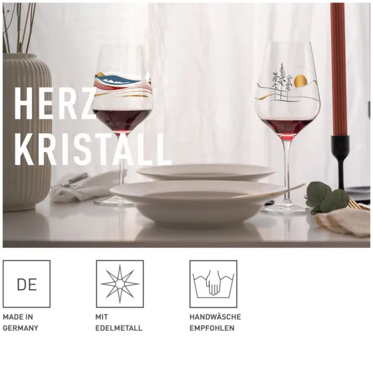 Sehr bewusst erinnert das umlaufende Motiv mit feinen Details aus Roségold an die Ästhetik fernöstlicher Landschaften. Klar erkennbare Strukturen in der Kombination mit filigranen Elementen wecken die Fantasie und machen Lust auf unvergessliche Genussmomente. Die Abbildungen strahlen Harmonie und Leichtigkeit aus. Als schöne Geschenkidee zu einer besonderen Gelegenheit lässt sich das RITZENHOFF Weißweinglas HERZRISTALL mit weiteren Gläsern der beliebten Serie ergänzen. Alle Gläser sind spülmaschinen geeignet und Made in Germany.