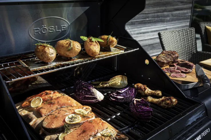 Der schwarz-graufarbige BBQ Station Gasgrill ALL FLAME PEER ist 127 cm breit und 61 cm tief. Er ist aus Metall gefertigt und bietet als Extra für Steaks eine CRISPZONE mit zusätzlichem 3-kW-Brenner zum schnellen Aufheizen auf 450 °C. Mit seiner Grillfläche von 60 x 45 cm und einem Warmhalterost im Format 60 x 16 cm ist der BBQ Station Gasgrill ALL FLAME PEER von RÖSLE perfekt für jede Grillparty im Freien. Die 3 Hauptbrenner für einen Gasdruck von 50 Millibar bestehen aus Edelstahl und bringen je 3,5 kW. Dazu kommt ein solide ausgelegter Deckel mit großen Control Panels sowie integriertem Thermometer. Zudem ist der Gasgrill mit klappbaren Seitentischen ausgestattet.