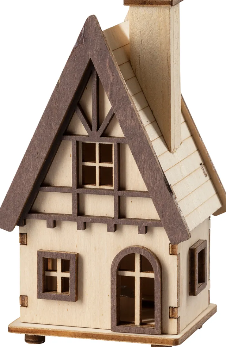 Das Deko-Objekt aus der Serie RÄUCHERHAUS I besteht aus Holz und ist für den Innenbereich geeignet. Das Haus misst 12,5 cm in der Tiefe, 7 cm in der Breite und 5,5 cm in der Höhe. Die Hauptfarbe ist mehrfarbig, wobei naturfarbene und dunkle Holztöne sichtbar sind. Das Design erinnert an ein Fachwerkhaus mit markanten Holzbalken, einem steilen Satteldach und einem angedeuteten Schornstein. Mehrere kleine, rechteckige Fenster sowie eine rundbogige Tür prägen die Vorderseite. Die Oberfläche zeigt eine feine Holzstruktur, die die natürliche Optik unterstreicht. Durch die detailreiche Ausarbeitung eignet sich das Objekt als dekoratives Element für verschiedene Wohnräume.
