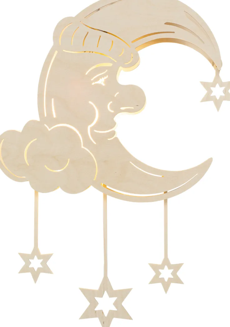 Dieses Lichtobjekt aus der Serie TRÄUMENDER MOND besitzt eine charakteristische Mondform mit einem freundlich gestalteten Gesicht, welches an eine schlafende Mondsichel erinnert. Das Objekt ist aus hellem, unbehandeltem Holz gefertigt und wirkt durch die sichtbare Maserung natürlich und dezent. Die Oberfläche ist glatt und zeigt präzise ausgeschnittene Konturen, die das Motiv klar hervorheben. Drei unterschiedlich lange Holzstäbe mit sternförmigen Anhängern vervollständigen das Design und sorgen für eine verspielte Optik. Die dezente Beleuchtung unterstreicht die Konturen des Mondes und der Wolke, wodurch eine sanfte Lichtstimmung im Raum erzeugt wird.