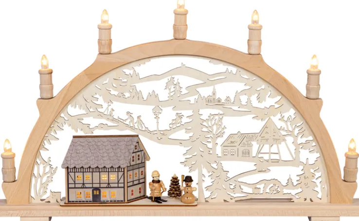 Die integrierte Beleuchtung besteht aus mehreren warmweiß leuchtenden Lampen, die entlang des oberen Bogens angeordnet sind. Das Lichtobjekt ist für den Einsatz im Innenbereich konzipiert. Die Kombination aus mehrfarbigen, handbemalten Elementen und naturbelassenem Holz unterstreicht den handwerklichen Charakter und sorgt für eine stimmungsvolle Atmosphäre in der Winter- und Adventszeit.