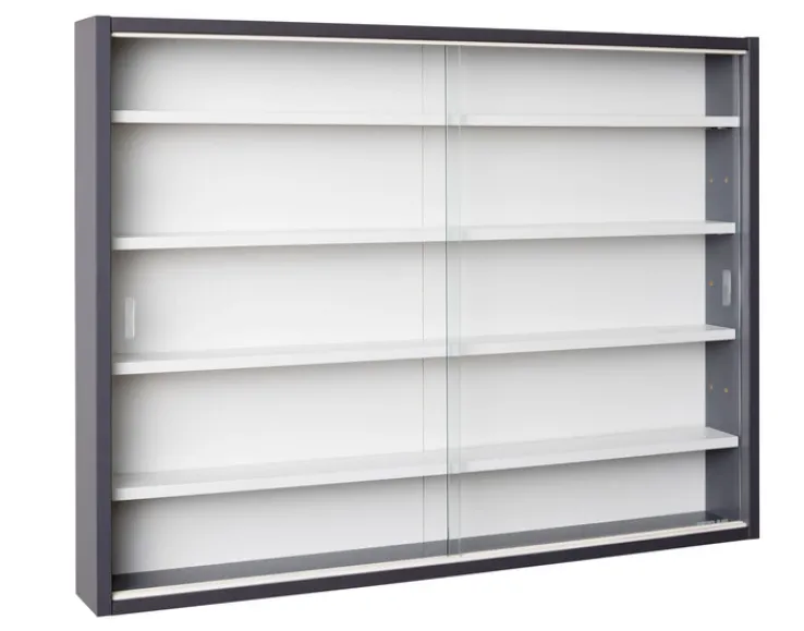 Die schlicht elegant designte Sammlervitrine HENDRIK ist in den Farben Weiß und Grau mit Schiebetüren aus Klarglas gestaltet. Das Modell hat die Maße 80 Zentimeter Breite, 60 Zentimeter Höhe und 9,5 Zentimeter Tiefe.