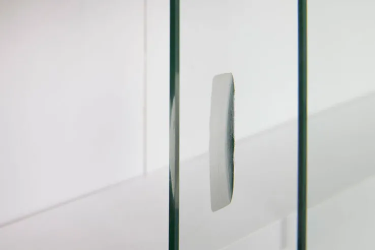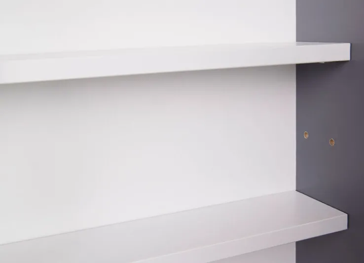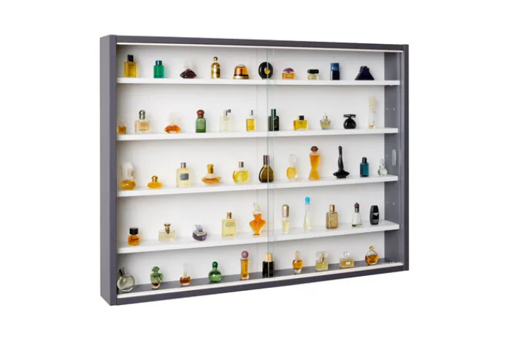 Die moderne Vitrine überzeugt mit einer ebenmäßigen Optik, da die Türen statt mit Griffen mit praktischen Griffmulden gearbeitet sind. Sowohl das Tempered Glas als auch der Korpus und die vier Einlegeböden, die aus Spanplatten bestehen, sind leicht zu pflegen. Das 9,5 Kilogramm schwere Modell kann an der Wand aufgehängt werden, damit die Sammlerobjekte auf allen fünf Ebenen in Augenhöhe gut zur Geltung kommen.