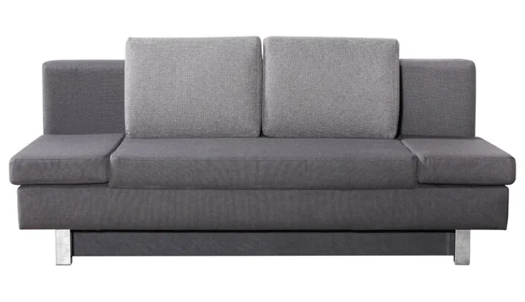 Das moderne Schlafsofa TINO hat eine Breite von etwa 200 cm und ist das ideale Schlaf- und Sitzmöbel für den modern eingerichteten Wohn- oder Gästebereich. Durch das trendige Design mit chromfarbigen Füßen aus Metall und die dunkelgrauen Polster ist das 3-Sitzer-Sofa ein Blickfang und problemlos in bereits bestehende Einrichtungen integrierbar. Für eine angenehme Sitz- und Liegeposition sorgen weiche Polster und ein hochwertiger Federkern. Für Decken und Kissen steht ein Bettkasten zur Verfügung.