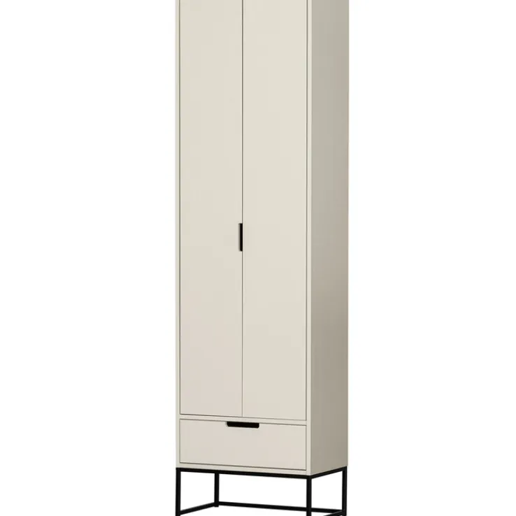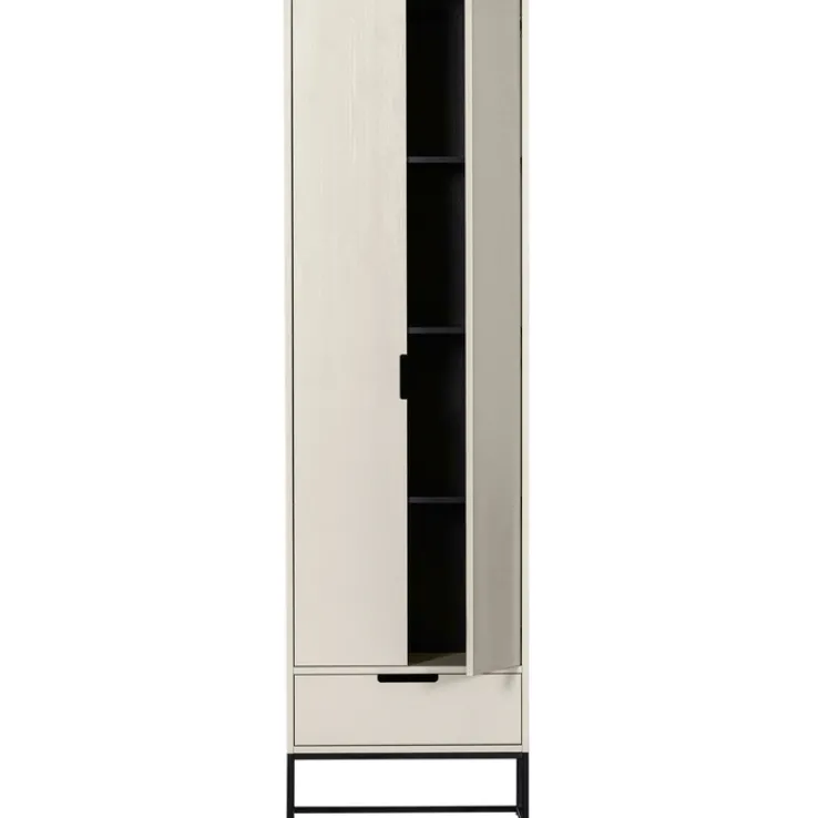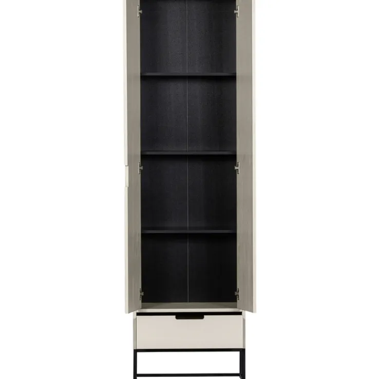 Der Schrank SILAS besteht aus robustem gebürstetem und lackiertem Kiefer Massivholz und einem schwarzen Metallsockel. Mit einer Tiefe von 36 cm lässt er sich auch in kleine Dielen integrieren. Neben dem stilvollen, modernen Look überzeugt der Mehrzweckschrank mit Schubkasten und Schrankteil mit viel Stauraum. Hinter den zwei Drehtüren befinden sich drei Einlegeböden, auf denen sich Alltagsgegenstände übersichtlich aufbewahren lassen.