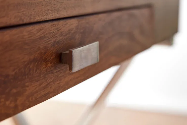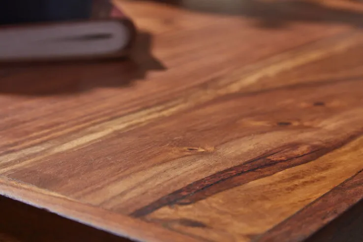 Die Tischplatte des Schreibtischs ist aus hochwertigem Sheesam-Holz hergestellt. Das massive Holz ist aufwendig geschliffen und hat gebeizte Oberflächen. Das stabile Untergestell besteht aus Edelstahl. Das Untergestell des Schreibtischs ist aufwendig verchromt.