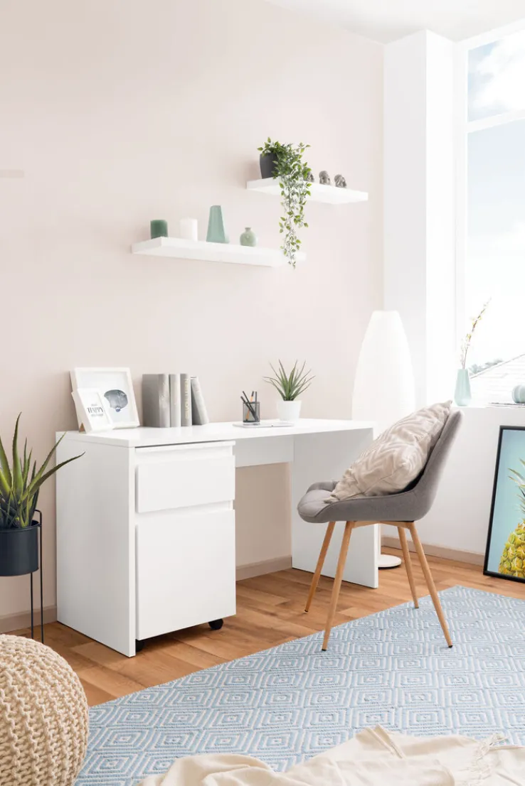 Dieser preisgünstige Schreibtisch von porta.de ist aus der Holznachbildung MDF (Mitteldichte Faserplatte) gefertigt. Die matte, weiße Arbeitsplatte hat als Unterbau ein stabiles Kufengestell. Mit seinen Maßen bietet dieser einfache Schreibtisch viel Beinfreiheit, eine große Arbeitsfläche, Platz für Laptop und Drucker. Darunter lässt sich problemlos ein Rollcontainer stellen, für zusätzlichen Stauraum bei genug Beinfreiheit. Hinten unter der Arbeitsplatte verläuft quer eine Stabilisierung, die zusätzlich für gute Standfestigkeit sorgt. Insgesamt ein sehr praktischer, moderner Schreibtisch, einsetzbar im gesamten Wohnbereich.