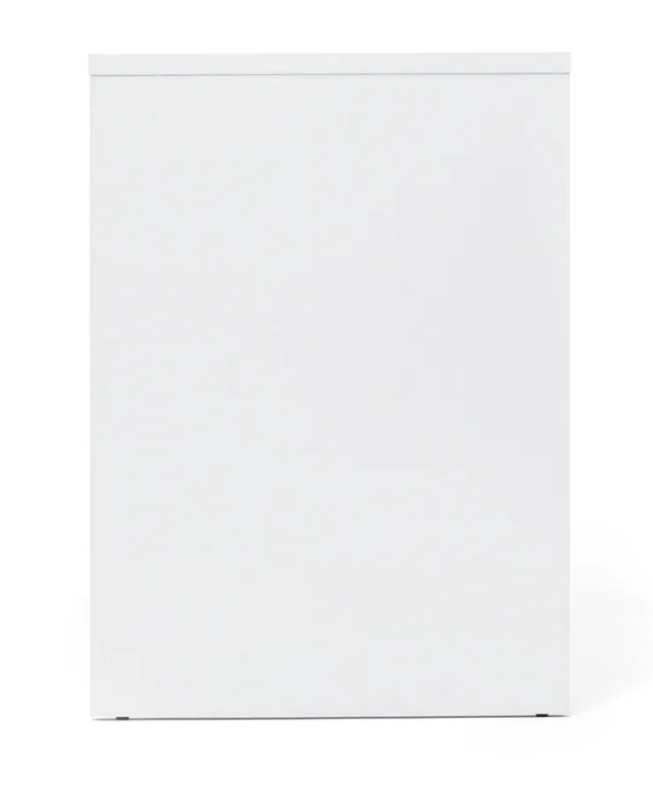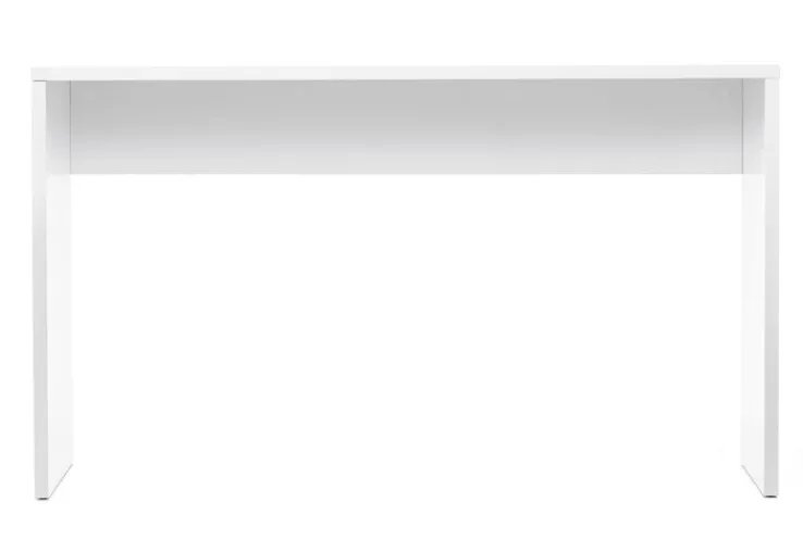 Der 75 cm hohe, weiße Schreibtisch ist 130 cm breit und 54 cm tief. Er beeindruckt mit solider Sachlichkeit und guter Qualität.