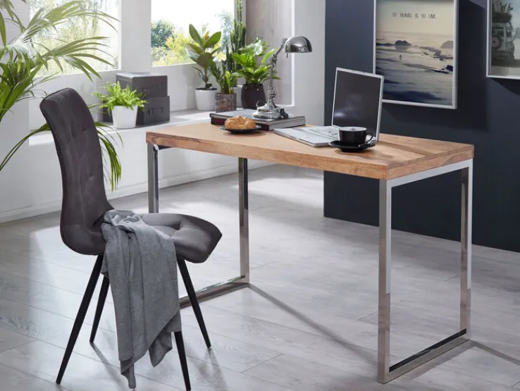 Der Schreibtisch GUNA – massiv gefertigt vom Hersteller aus dem Holz der Akazie – hat ein chromfarbiges Design und eine Größe von 120 x 60 cm. Mit diesen Maßen entspricht der Schreibtisch den Empfehlungen für einen ergonomisch eingerichteten Arbeitsplatz. Er bietet umfangreichen Platz für einen Laptop und die Schreibutensilien, die in unmittelbarerer Griffnähe sein sollten.