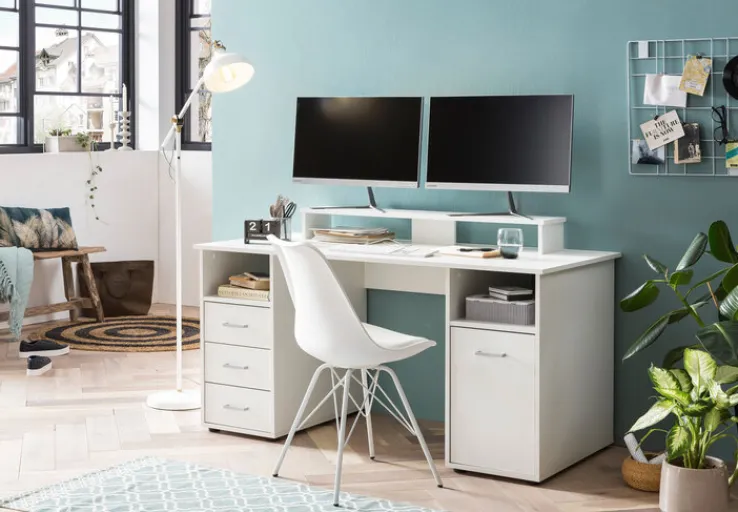 Der Schreibtisch NIELS ist kreideweiß und hat eine Länge von 150 cm, eine Tiefe von 70 cm und eine Höhe von 86,7 cm. Der Schreibtisch hat drei Schubkästen, zwei offene Fächer, eine Drehtür sowie einen praktischen Monitoraufsatz.
