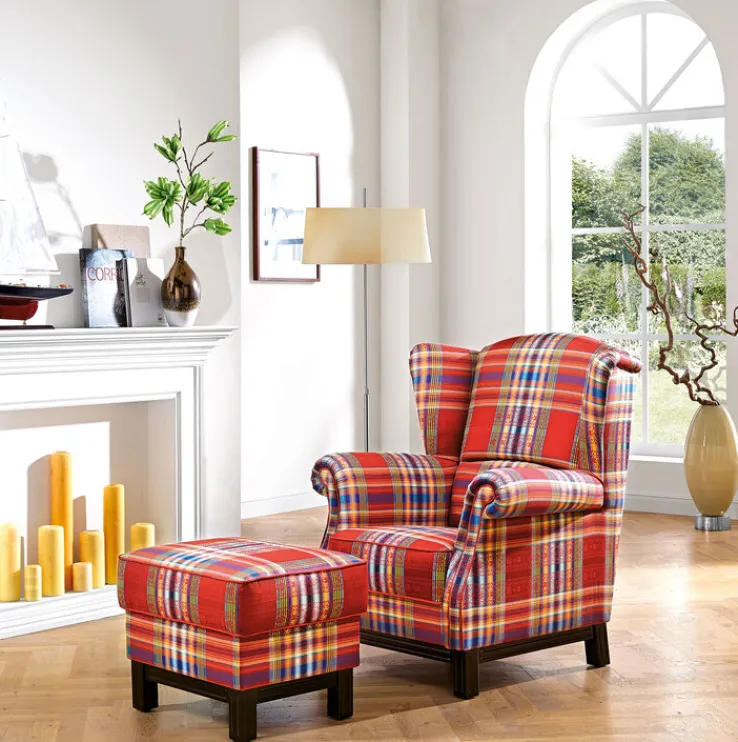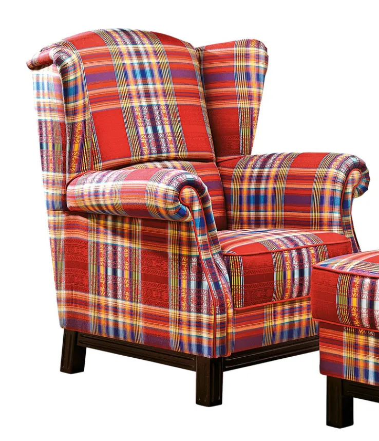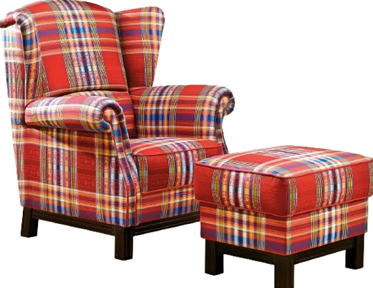 Der klassische Ohrensessel SYDNEX der Marke Schröno strahlt Gemütlichkeit und eine urige Ruhe aus. Das Karomuster ist in den Farben Gelb, Weiß, Braun und Blau mit der Farbe Rot als Grundton gehalten. Der Stoffbezug wird mit einem umlaufenden Keder abgerundet.