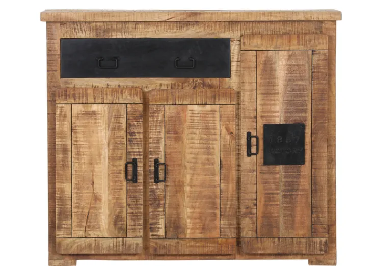 Gefertigt aus massivem Mangoholz, das sägerau gebeizt und lackiert ist, bietet er eine robuste und langlebige Konstruktion. Die Kombination aus braunen und schwarzen Farbtönen verleiht dem Möbelstück eine moderne und zugleich rustikale Optik.