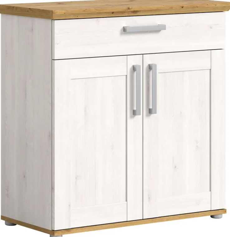 Der Schuhschrank besteht aus Spanplatten und besitzt unterschiedliche Dekoren in Holznachbildung. Korpus und Türen sind mit einem Sibiu Lärche Dekor versehen, Abdeck- und Grundplatte aus einem Dekor von naturbelassener Artisan Eiche. Türen und der Schubkasten besitzen metallfarbige Griffe zum öffnen und für den guten Stand sorgen chromfarbige Füße.