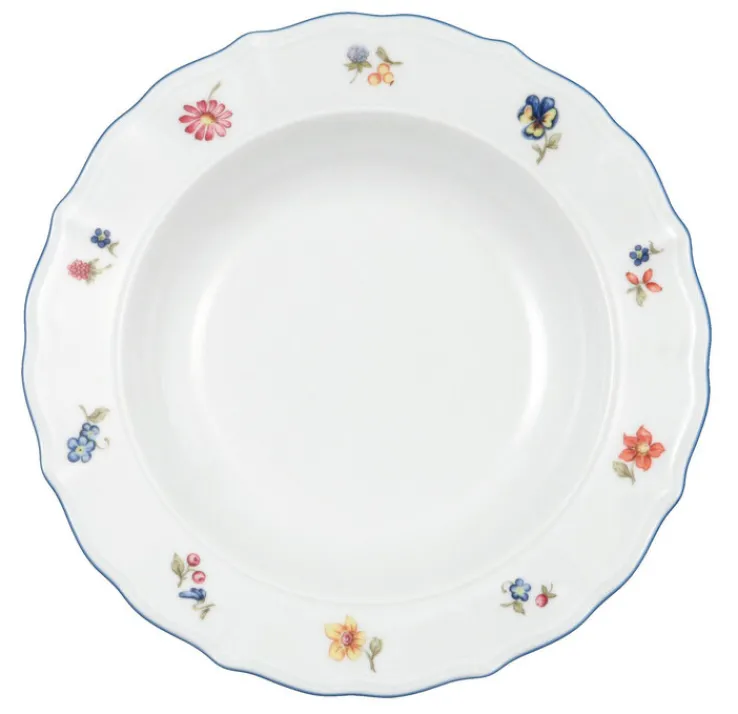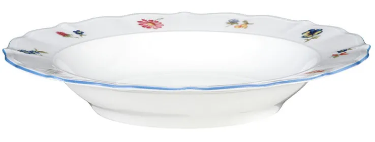 Dieser tiefe Porzellan Suppenteller SONATE NOSTALGIE in Weiß mit einem Streublumendekor hat einen Durchmesser von circa dreiundzwanzig Zentimeter und Suppe oder Eintopf schmecken daraus doppelt so gut. Zusammen mit dem Speiseteller der Serie SONATE NOSTALGIE ist dieser tiefe Teller eine sehr gelungene Gedeckkombination. Das farbenfrohe Streublumendekor auf dem weißen Porzellan der Serie SONATE NOSTALGIE zeugt von moderner Landhaus Romantik. Mit der sommerlichen Frische von Streublumen und dem zarten, blauen Rand verzaubert die Porzellan Serie SONATE NOSTALGIE Sie und Ihre Gäste auf ganz besondere Weise. Dekorativ und alltagstauglich, das ist die Geschirr Serie SONATE NOSTALGIE, die Bereicherung für Ihr Zuhause. Eine Vielzahl an passenden Geschirrteilen der Serie SONATE NOSTALGIE finden Sie in Ihrem Online Shop.