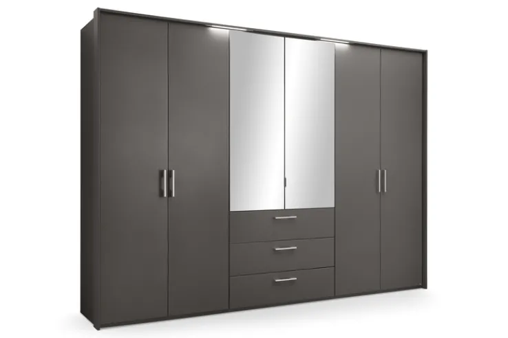 Der Drehtürenschrank HENDERSON aus der Serie set one by Musterring präsentiert sich im modernen Stil und überzeugt durch seine klare Linienführung und die dezente Farbgebung in Graphit metallic. Die Front ist in einem matten Grauton gehalten und wird mittig durch zwei Spiegeltüren ergänzt. Die Spiegelfront sorgt nicht nur für eine praktische Nutzung, sondern verleiht dem Schrank zudem eine zeitgemäße Optik. Die formschönen Griffe aus Metall unterstreichen das moderne Design und ermöglichen ein komfortables Öffnen der Türen und Schubkästen.
