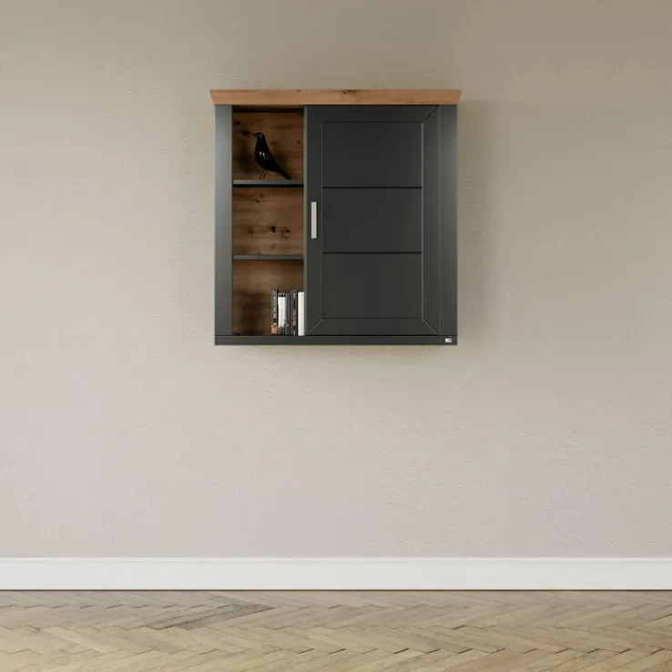 Ob in der Küche, im Wohn- oder Schlafzimmer: Wo immer Akzente gesetzt werden sollen, ist der hängende Schrank eine starke Wahl. Der Schrank hebt sich dank der Anthrazit-Optik erstklassig von hellen Wänden ab. Für einen Schuss Natürlichkeit sorgt zudem die Holznachbildung in sehenswerter Eichenoptik. Besonders schön wirkt es, wenn der Schrank zusammen mit anderen Schränken und Regalen von Musterring kombiniert wird, die sich durch eine ähnliche Optik auszeichnen.