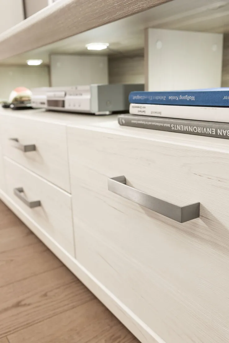 Vier Bügelgriffe erleichtern das Öffnen der verschiedenen Schubkästen des Lowboards.