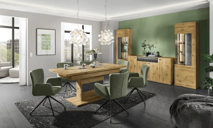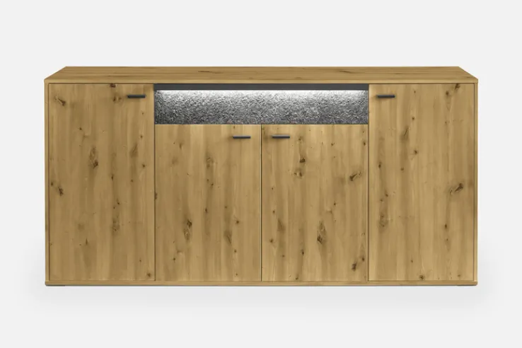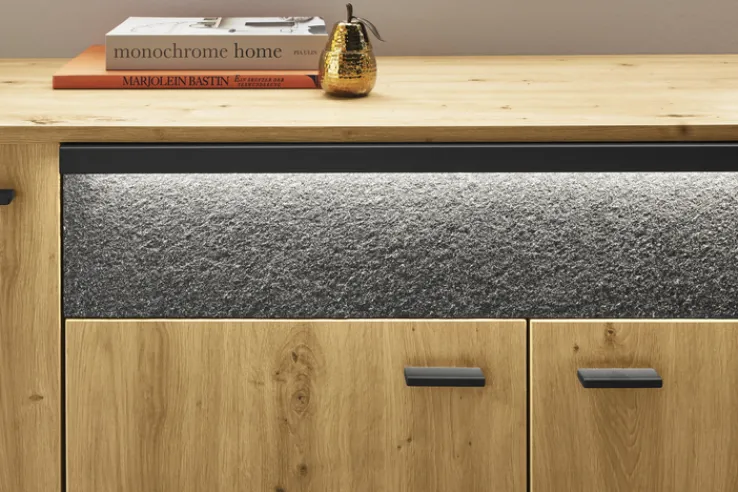Das 184 x 89 cm große Sideboard DELTON von set one by Musterring nutzt einen Eiche Artisan Dekor Korpus und verschafft diesem durch das mittige Sandstein-Element eine moderne und kontrastreiche Note. Ein Beleuchtungselement ist in dem Sideboard schon inklusive und sorgt speziell in den Abendstunden für eine heimelige Atmosphäre und Raumwirkung.