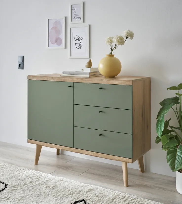 Das Sideboard ALVA mit der schönen Farbkombination salbeifarbig-braun misst 107 x 83. Es stellt eine optisch ansprechende Ablage- und Aufbewahrungsmöglichkeit dar.
