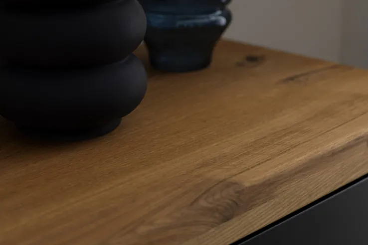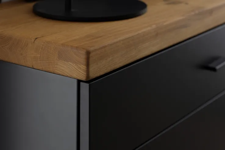 Das Sideboard aus der Serie BOGOTA vereint modernes Design mit praktischer Funktionalität. Mit einer Breite von 150 cm, einer Höhe von 96 cm und einer Tiefe von 37 cm bietet es großzügigen Stauraum. Die Kombination aus massiver Wildeiche und anthrazitfarbenen Elementen verleiht dem Möbelstück eine elegante und zeitgemäße Optik. Die lackierte Oberfläche sorgt für eine pflegeleichte und langlebige Nutzung.