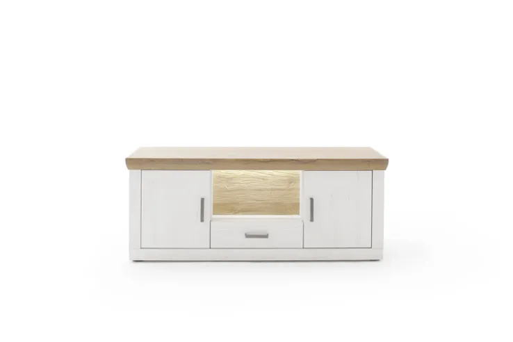 Das Design des Sideboards zeichnet sich durch klare Linien und eine moderne Ästhetik aus. Die beiden Türen und die Schublade bieten ausreichend Stauraum für Ihre persönlichen Gegenstände. Der offene Bereich in der Mitte, der durch eine dezente Beleuchtung hervorgehoben wird, eignet sich ideal zur Präsentation von Dekorationsobjekten oder Büchern. Die Griffe in einem dunklen Ton setzen einen eleganten Akzent und runden das Gesamtbild harmonisch ab. Dieses Möbelstück ist nicht nur praktisch, sondern auch ein echter Blickfang in jedem Wohnraum.