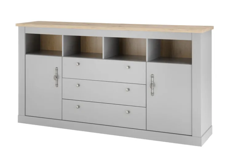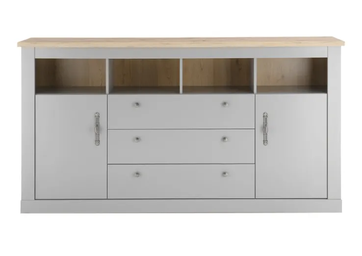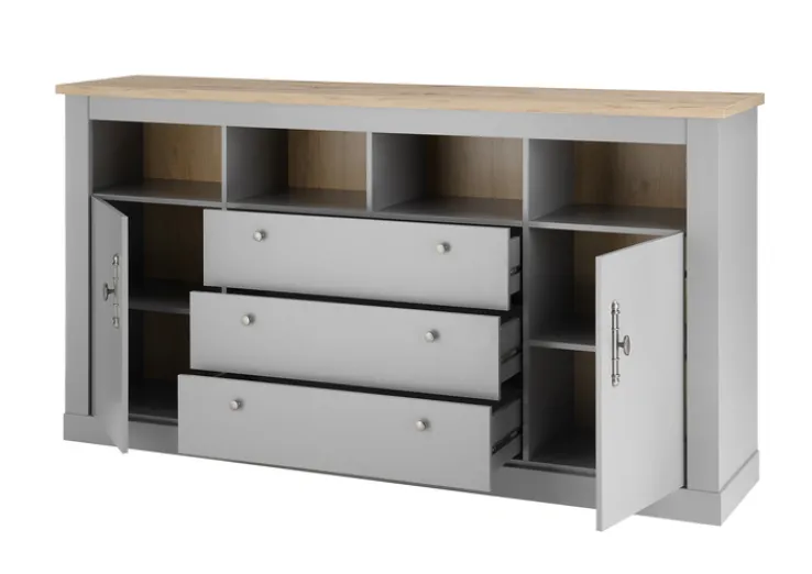 Gefertigt aus Holznachbildung, besticht das Sideboard CHAMBORD optisch mit Applikationen im Artisan-Oak-Dekor und den dekorativ gestalteten Griffen. Es ist mit drei Schubkästen und zwei Drehtüren ausgestattet. Für eine ordentliche und übersichtliche Unterbringung großer und kleiner Gegenstände sorgen zwei Einlegeböden und vier offene Fächer. Auf der Abdeckplatte können verschiedene Dekorationsgegenstände angeordnet werden. Somit trägt das Sideboard zu einer gemütlichen und stilvollen Atmosphäre in Wohn- oder Esszimmer bei.