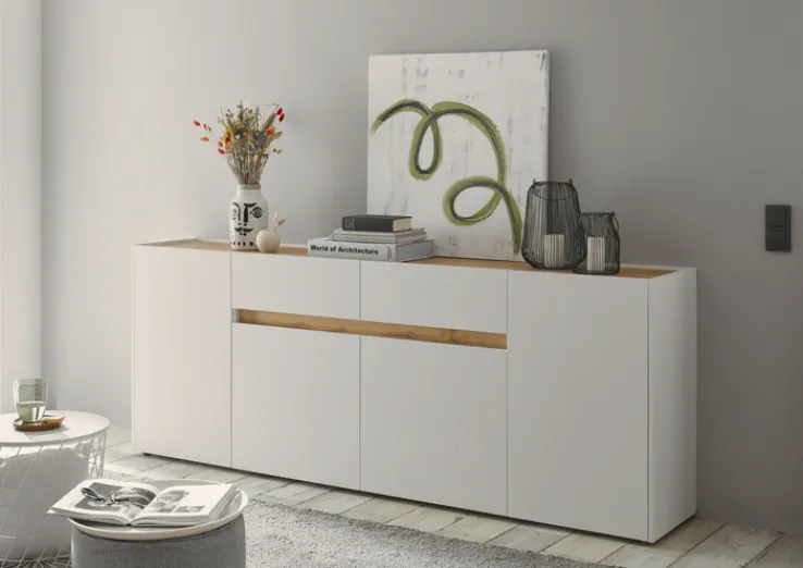 Dieses Sideboard besteht aus einer ansprechenden weißen Holznachbildung und besitzt Akzente in schickem Eiche-Wotan-Dekor, wodurch es das visuelle Highlight in jedem Wohnzimmer darstellt. Das Möbel hat eine Tiefe von 40 cm und verfügt über vier Türen, zwei Schubkästen sowie vier Böden, wodurch es über sehr viel Stauraum verfügt, sodass es die Ordnung im Raum unterstützt. Das heißt, sowohl Dinge, auf die man einen schnellen Zugriff wünscht, als auch solche, die man seltener benötigt, finden hier ihren Platz.
